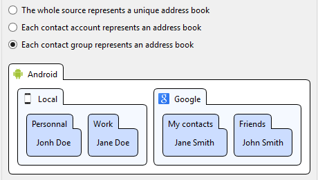 Virtual address books and calendars can be mapped to either the whole mobile device, accounts or groups.